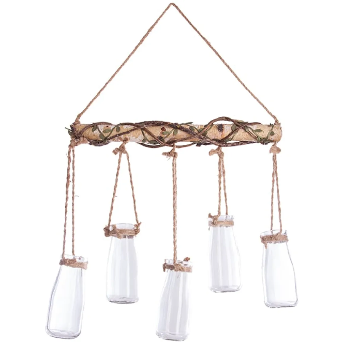 Suspensão de madeira com 5 jarras de vidro