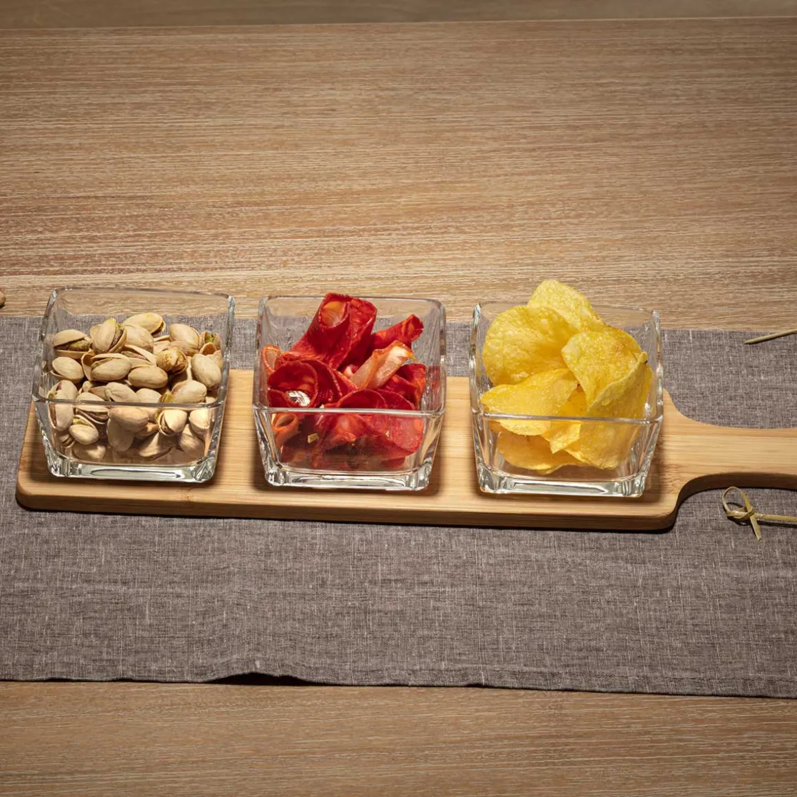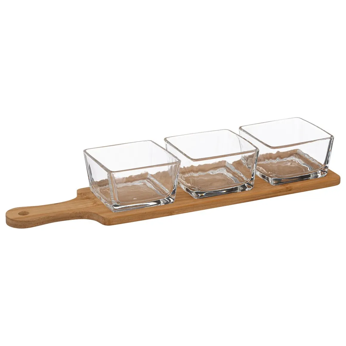 Conjunto de 3 taças de vidro com tábua em bambu